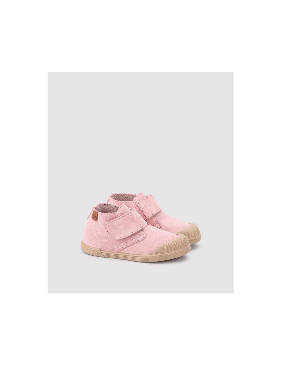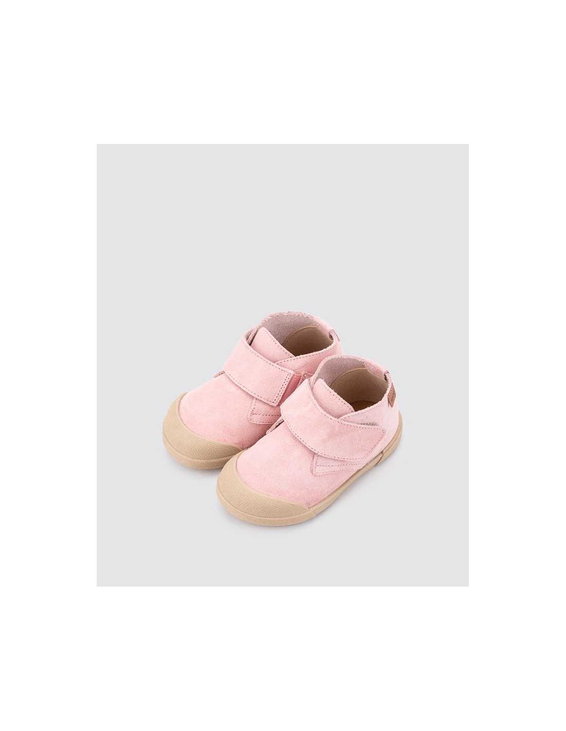 Botín de serraje de concepto barefoot, cero drop, flexible y blandito, plantilla acolchada extraíble y cierre adherente para mayor ajuste y autonomía.